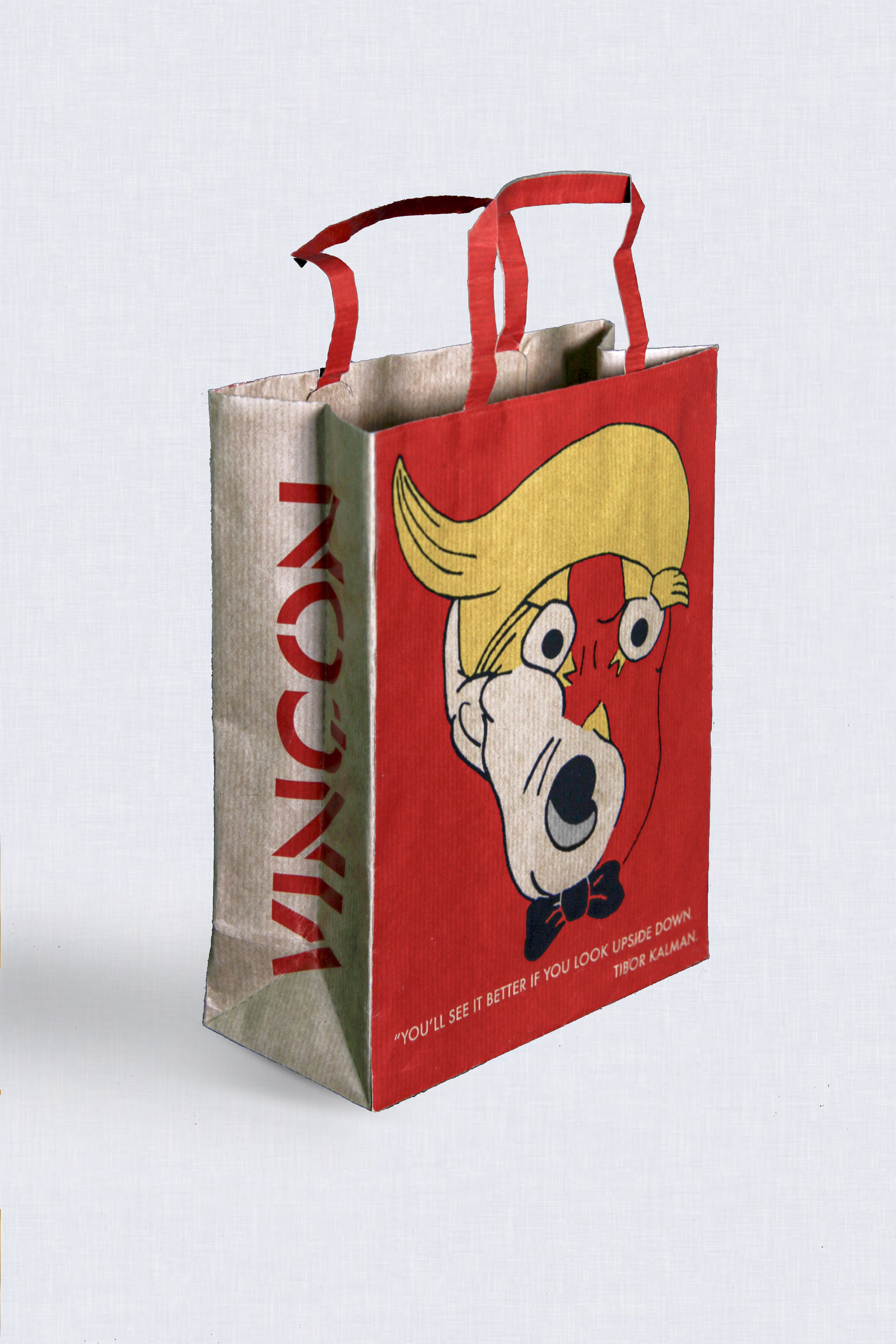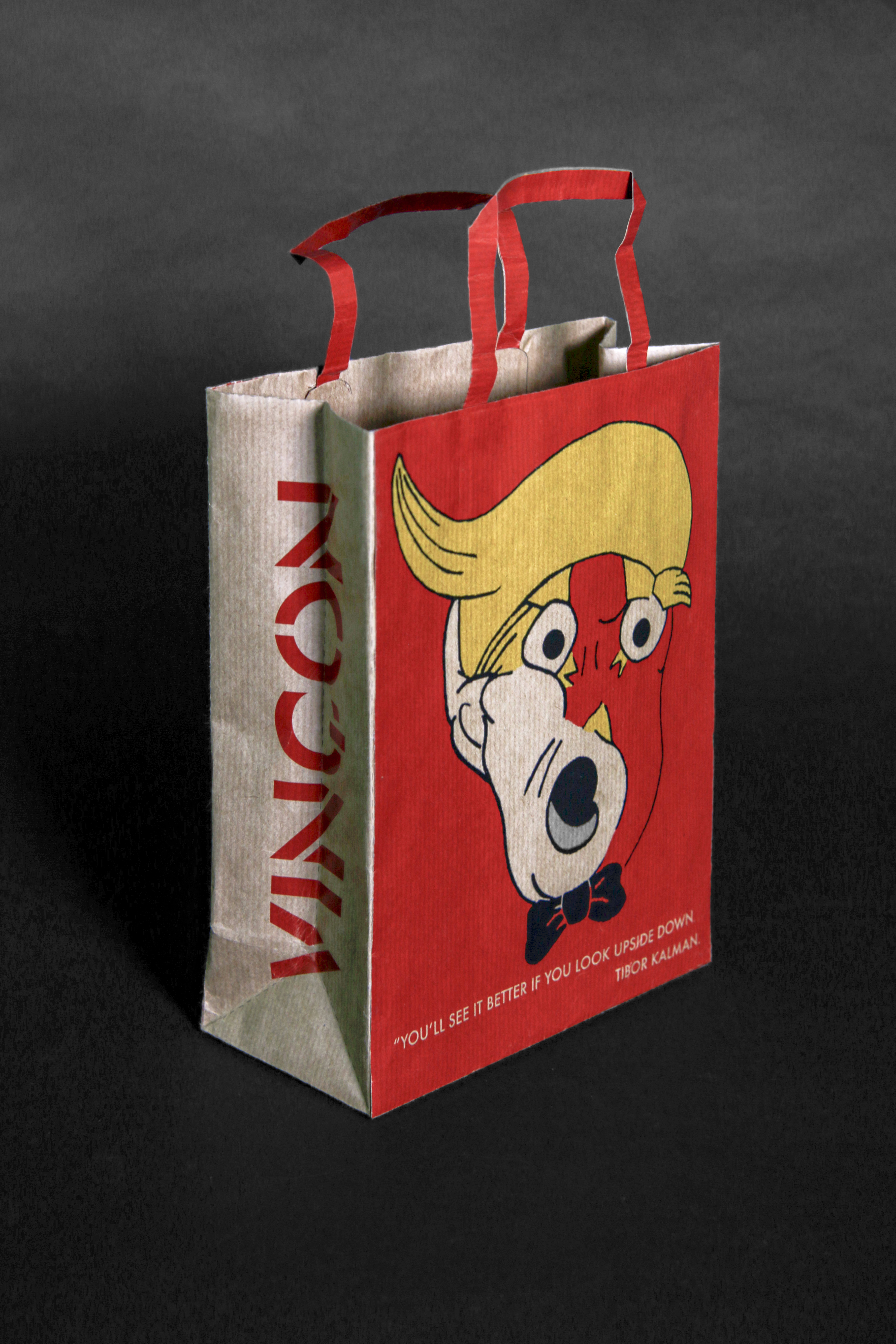 Si nos fijamos bien, a una cara de la bolsa veremos la cabeza de Donald Trump con una pajarita y con la boca bien abierta como si estubiera dando una orden. Pero si le damos la vuelta a la bolsa, en la otra cara veremos que el dibujo está del revés, y que esta vez, lo que nos muestra es un nido con dos pajaritos y su madre con un lazo en la cabeza.